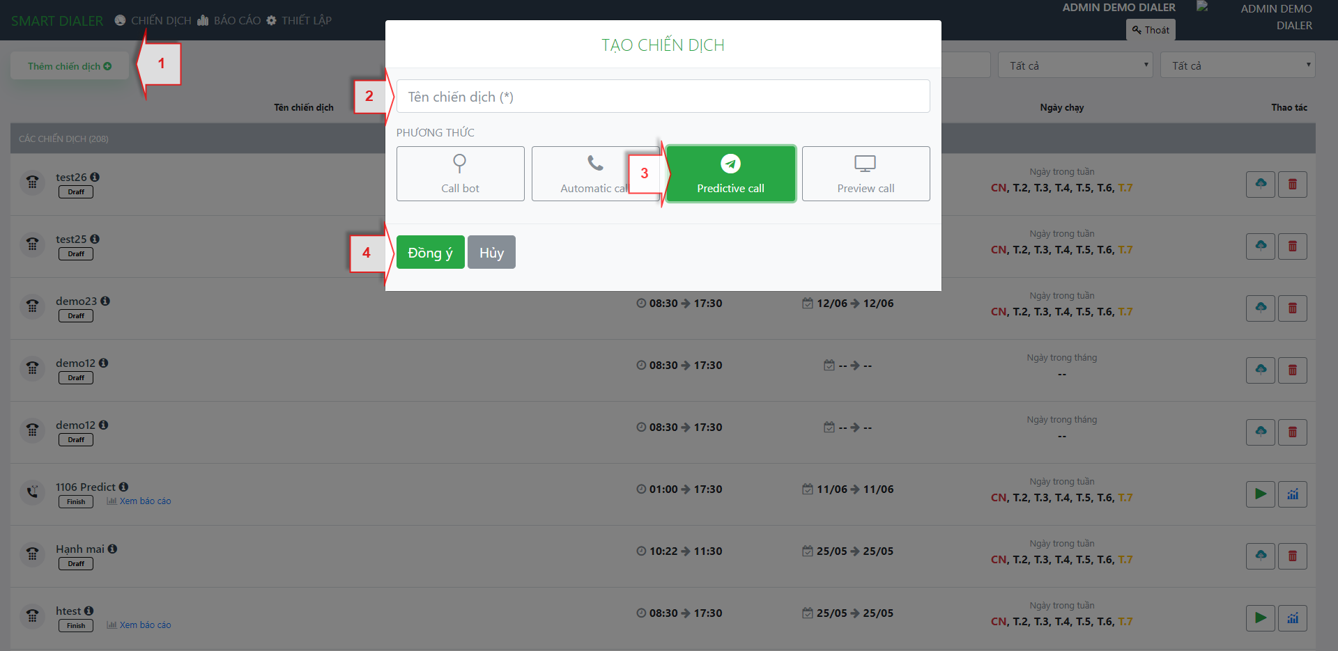 Thiết lập chiến dịch Predictive Call, Admin tiến hành theo các bước sau: