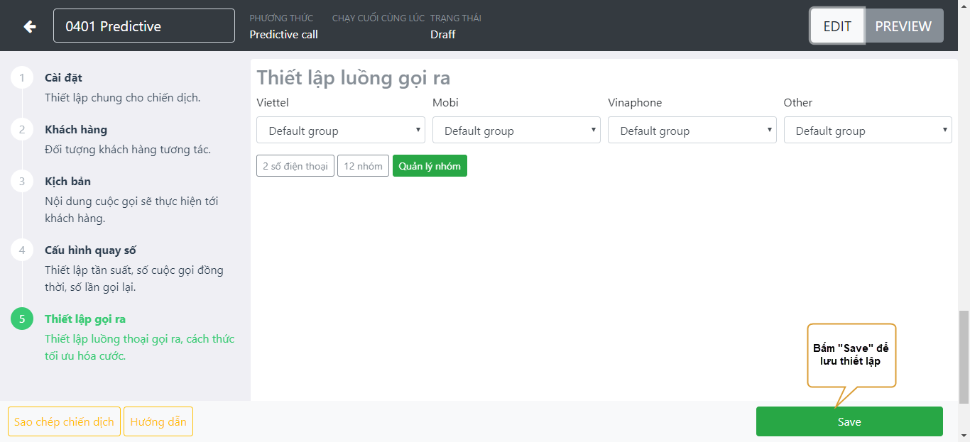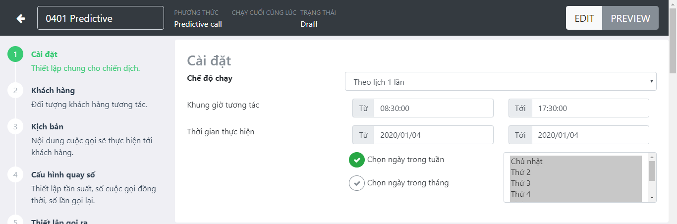 Bước 2: Cài đặt chế độ chạy Predictive Call